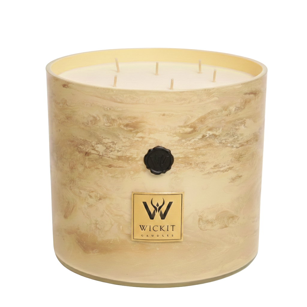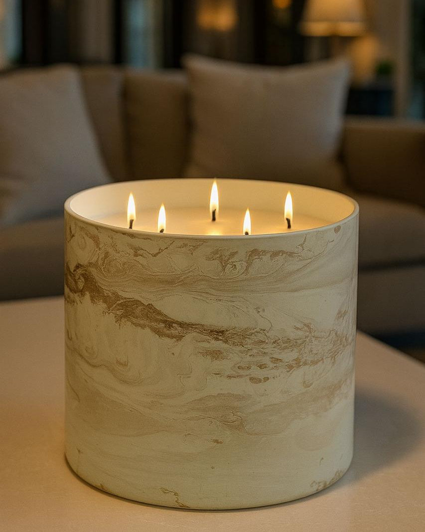A stunning hand-poured masterpiece, this candle features a swirling marble pattern in rich shades of cocoa, caramel, and warm earth. Each piece is individually crafted, creating a one-of-a-kind finish that mimics natural stone. The deep, fluid movement within the design brings an artistic, sculptural presence to your space—perfect for those who appreciate statement decor with a luxurious soul.Crafted in premium handblown glass, this candle elevates any room with its warm, grounding elegance.