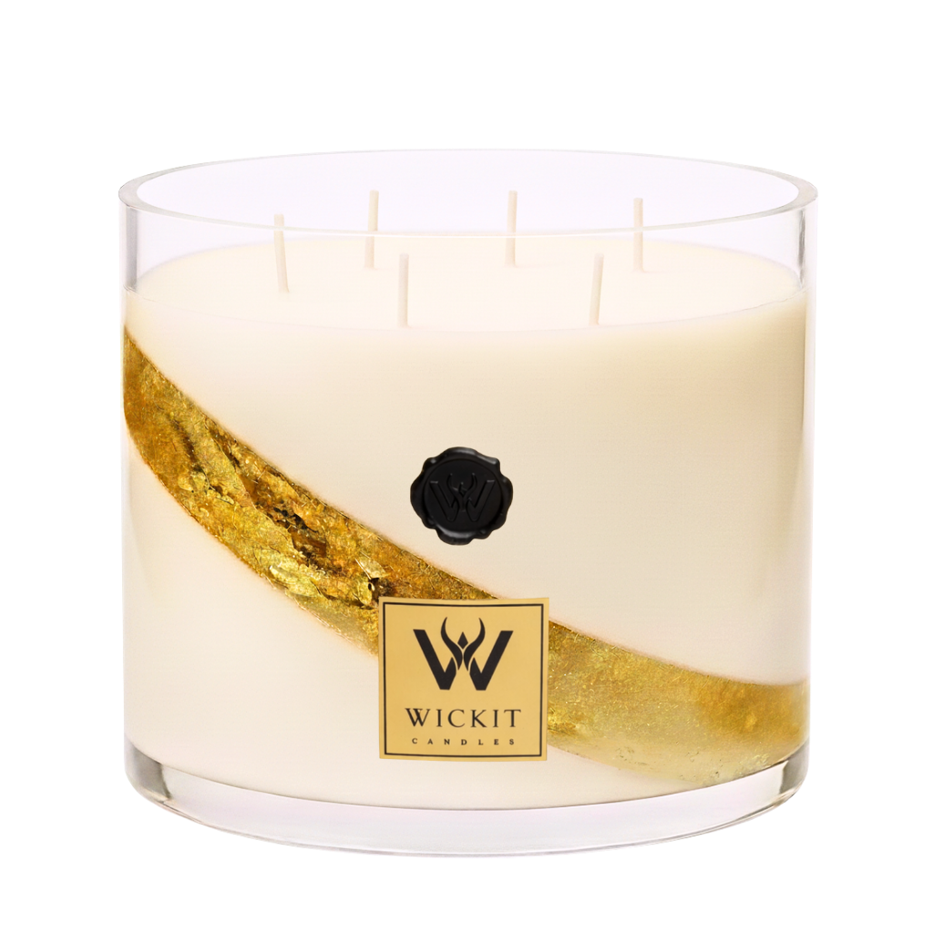 This candle pairs ivory wax with a clear glass vessel wrapped in a radiant gold band that softly glows when lit. Each piece has slight artisan variations, adding a refined touch to any space.